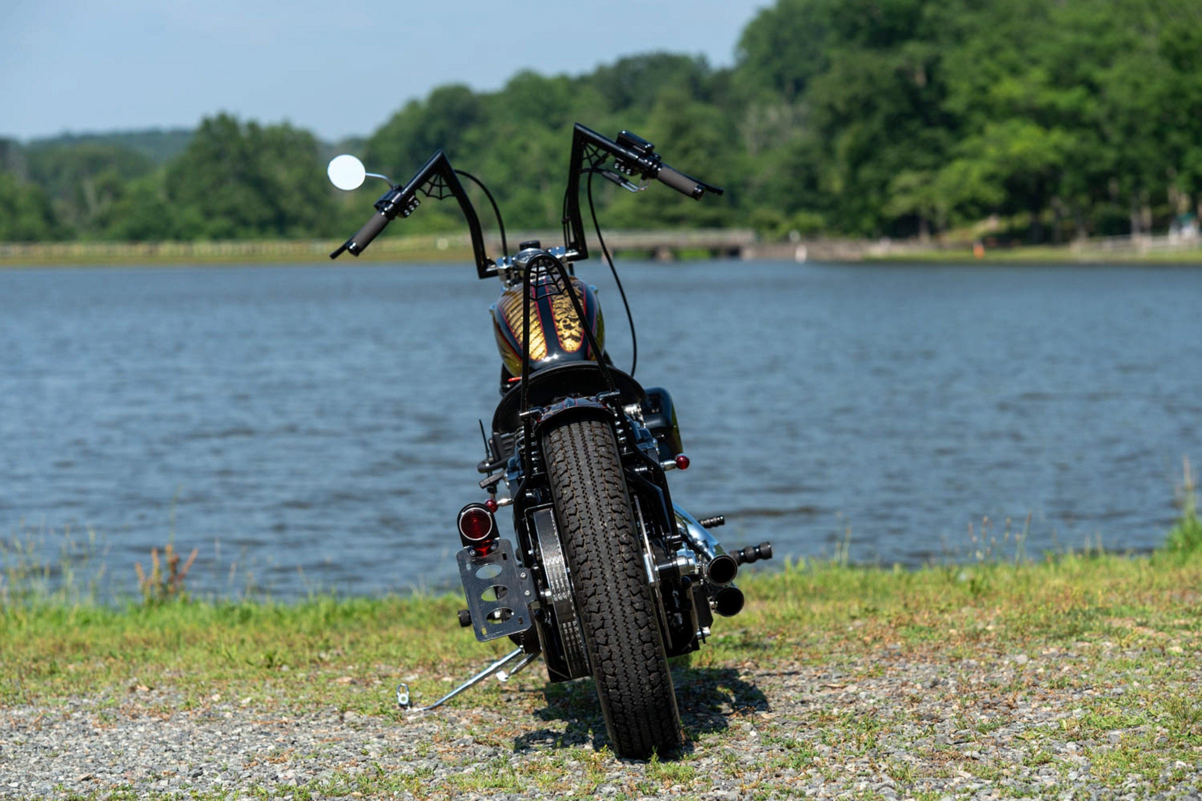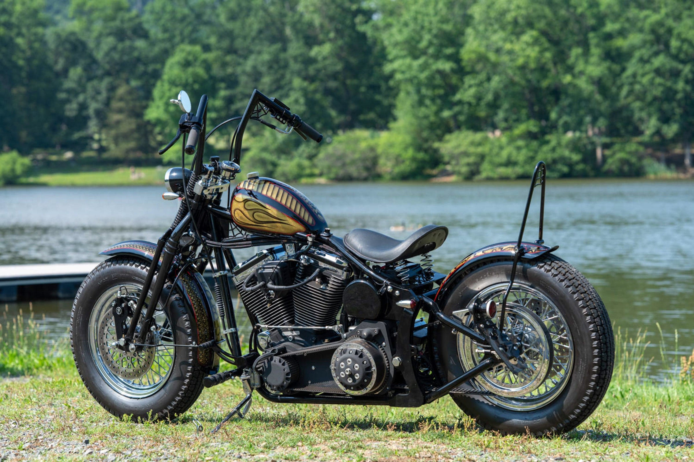 Black Paint, with Metal-Flake Gold/Red Inlay. Rear Fender is Ribbed and Mounted to the Swingarm; Tight to the Tire to look like a Rigid. USA Made Kraft Tech Frame features Stock Stretch, with 30 Degrees of Rake, and 1.25" Heavy Tubing. 80" 1340cc Black and Chrome Harley-Davidson Evolution Engine. S&S Super E Carburetor, with Black Teardrop Air Cleaner Cover. Pingel Chrome High-Flow Petcock Fuel Valve. Black Sissy Bar. Revtech Performance Series Black and Chrome Transmission. 2" Ultima Black Old-School Open Belt Drive Primary. Knucklehead-Style Replica Springer Front End. Crane Single Fire Ignition. Black GMA Forward Controls, and Matching Handlebar Controls, with Micro-Switches. Performance Machine 2-Piston Front Brake Caliper. 4-Piston Rear Brake Caliper. Chrome Vance & Hines Shortshots Staggered Exhaust. Black Oil Tank, with Battery Tray. Chrome Spoke Wheels, with Old-School Avon Speedmaster MKII Tires. Stainless Rotors. Mini Electronic Speedometer. LED Indicators for All Functions. Custom Stop-Lamp/License Plate Mount. 4" Mini Halogen Headlamp. High Torque Starter. Danny Gray Spring Seat. High-Performance Battery. An Incredible Bike for an Incredible Price!