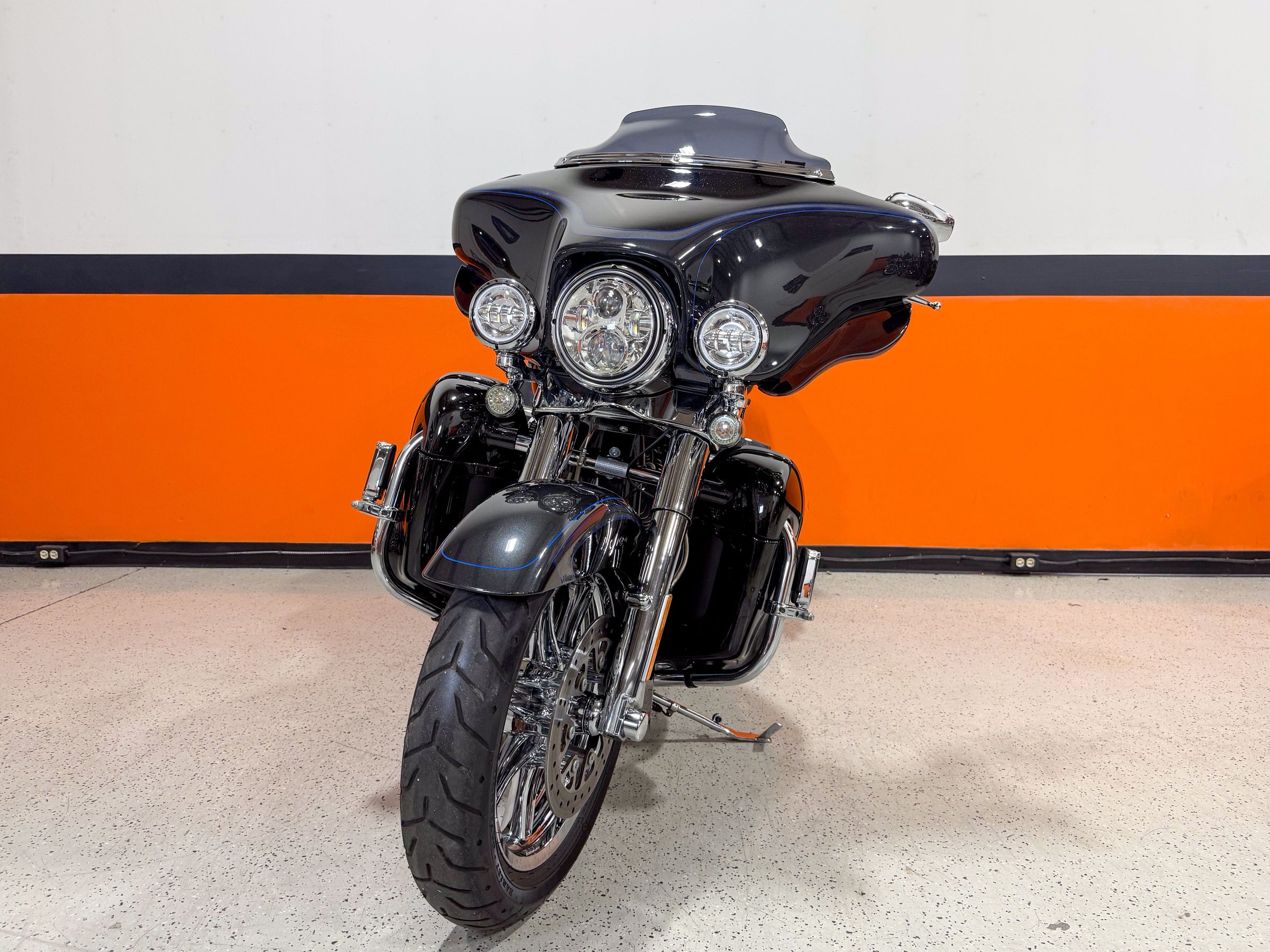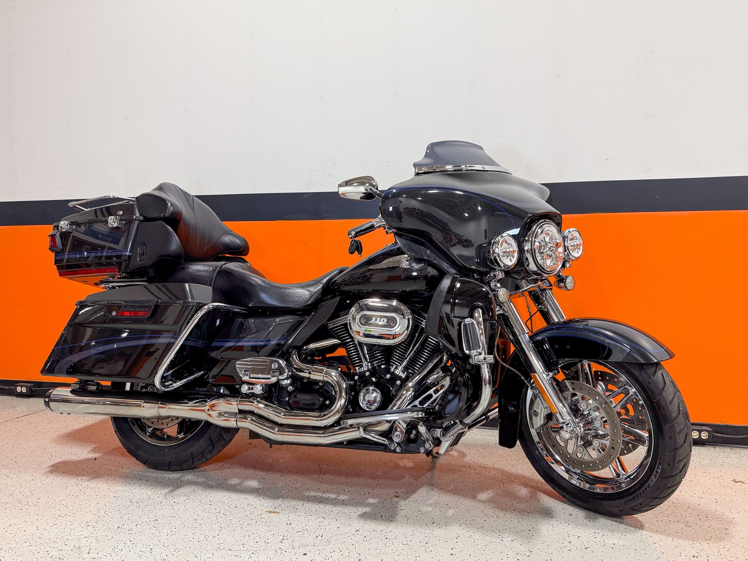 110th Anniversary Edition includes serialized 110th Anniversary cloisonné on the tank console insert, Midnight Pearl 110th Anniversary tank medallion, Black engine with Gloss Black covers, Midnight Pearl engine cover inserts, and exclusive paint scheme!