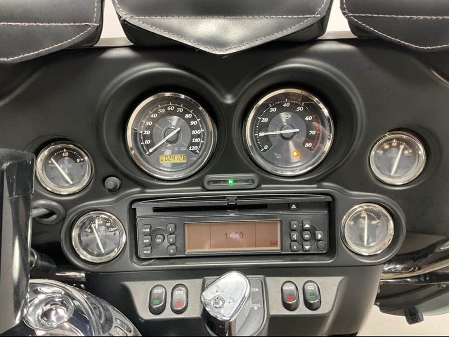 Titanium-faced, fairing mounted electronic speedometer and tachometer plus fuel, voltage, oil pressure and ambient air temperature gauges with white LED lighting